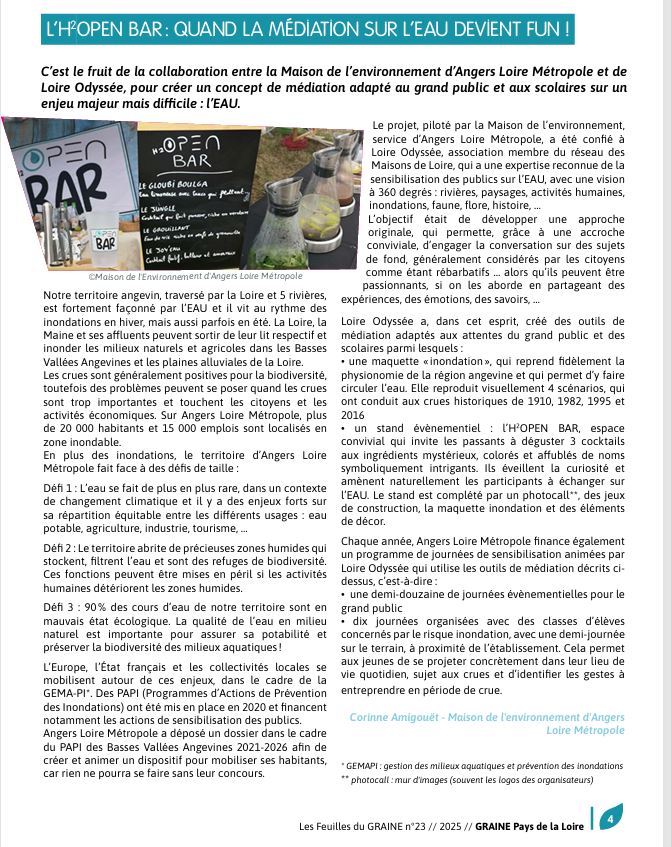 Le GRAINE Pays de la Loire met à l’honneur, dans sa brochure Les Feuilles du GRAINE n°23 (2025), une initiative originale et inspirante d’éducation à l’eau : l’H²OPEN BAR, porté par Loire Odyssée, association membre du réseau des Maisons de Loire.